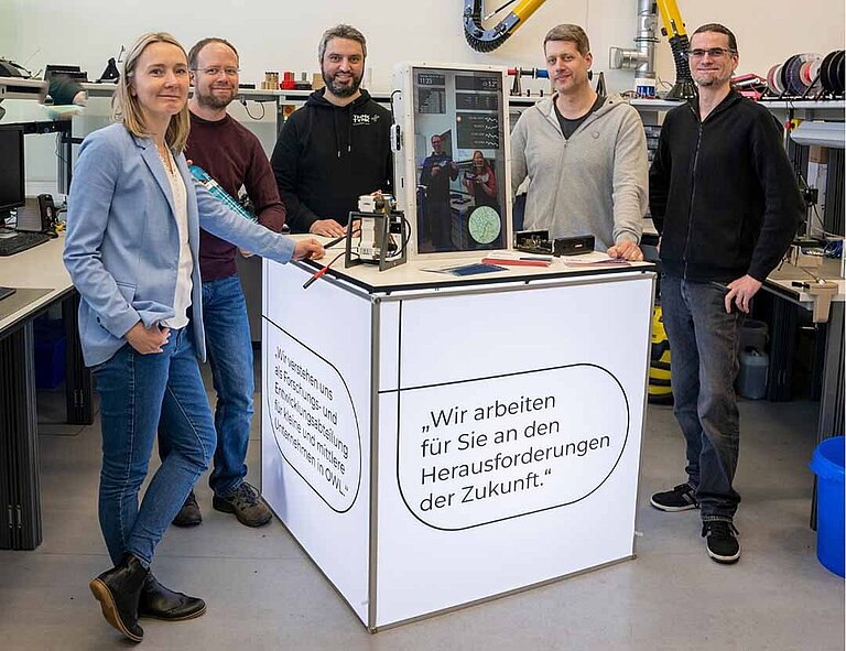 Das Team der Universität und der Fachhochschule Bielefeld freuen sich auf die Hannover Messe: (v. l. n. r.) Dr. rer. nat. Emma Davies und Kersten Kröger (ITES, FH Bielefeld), Pedro Campos Silva (Projektleiter ThinkTank OWL), Dr.-Ing. Marc Hesse und Christian Stollenwerk (CoR-Lab, Uni Bielefeld)